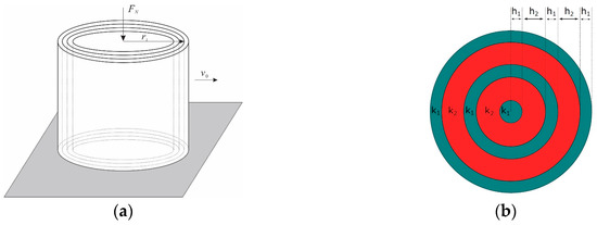 (a) The cylinder made of a number of ring-shaped cylinders with radii ri; and (b) exemplary surface with wear coefficients k1,2 and ring widths h1,2 for a cylinder with five rings.