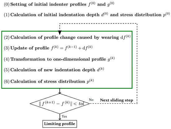 The algorithm employed to solve the contact problem with the method of dimensionality reduction (MDR) is outlined in the flowchart in Figure 3.