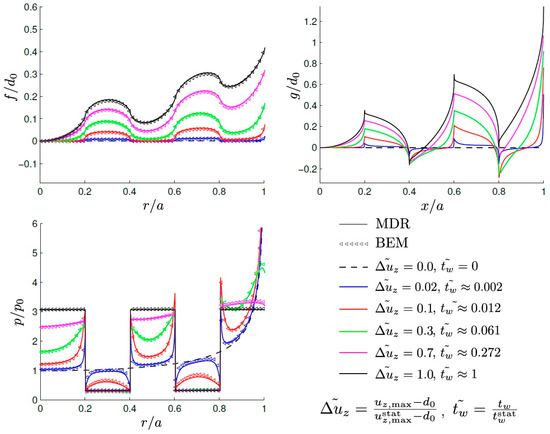 Figure 4 shows an example of the time-dependence of wear of the indented cylinder with five rings as described in Figure 1b: 3D profiles , and corresponding 1D profile , as well as stress distributions at distinct time steps. The analytical solution for an unworn cylinder is displayed by a dotted line for comparison. The profiles are normalized with the initial indentation depth calculated as in Equation (10), the stress is normalized by as in Equation (11) and and , respectively, by the radius of the cylinder . Furthermore, the numerical results from the simulation with the boundary element method [15] are added in this figure for comparison. It can be seen that the MDR the BEM match within a small tolerance. However, the simulation with the MDR is much faster than the BEM.