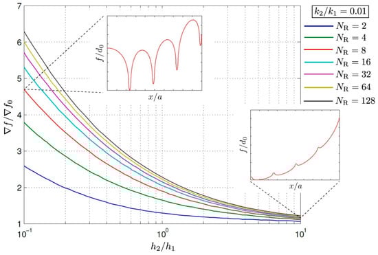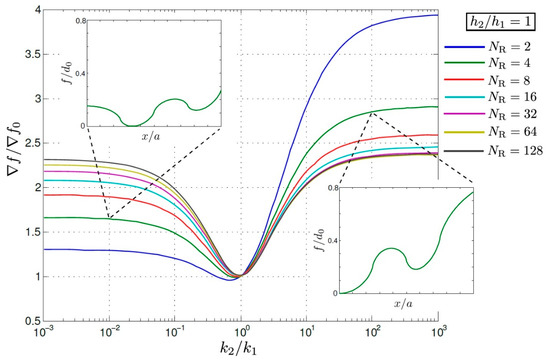 With the direct integration method described above, the limiting profiles, as well as their surface gradient for a variety of parameters and h2/h1 were determined. Dependence of friction on wear coefficients and ring widths are shown in Figure 6 and Figure 7. The surface gradient is normalized by , and the case of a homogeneous cylinder () is plotted versus the ratio of wear coefficients and ring widths h2/h1, respectively. Each curve represents the number of rings used as it was introduced in Figure 1.
