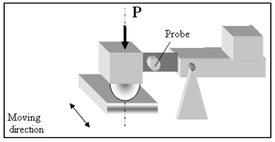 All tests were performed using a reciprocal ball-on-flat setup (Figure 1). The tests were performed using a load of 2.8 N and a sliding velocity of 1.5 mm/s over 3000 cycles. A steel-bearing ball (AISI 50100) with a diameter of 5 mm was moved against a stainless steel plate (AISI 316) with a hardness of 23–24 HRc. The flat plates were ground up to Ra = 0.1 µm. Three drops of polyalphaolefin-4 (PAO-4) oil (viscosity 18 mPa·s at 40 °C; Paz Oil Company Ltd., Haifa, Israel) with or without 1% (wt %) WS2 NP additives were added at the beginning of each 1000 cycles at the interface between the ball and the plate. The CoF and the wear (width of track) were measured during the tests. The experimental setup was developed and built in Holon Institute of Technology (HIT, Holon, Israel). All tests were performed at room temperature (23–24 °C, humidity 45–55%) and repeated 3 times for each sample.