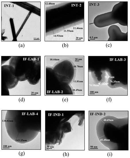 Transmission electron microscopy (TEM) images of the non-coated and coated WS2 INTs (a–c), laboratory-quality WS2 IFs (d–g), and industrial-quality WS2 IFs (h,i), tested as oil additives for friction reduction.