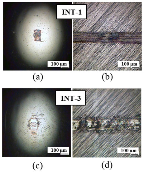 For the tests with INTs additives (Figure 4), OM images of the contact surfaces during friction agree with the results in Table 2: the CoF and width of the wear track seem to be the lower for the non-coated INTs compared to the coated ones. It was found that the non-coated INTs form a thin film on both contact surfaces (a,b). For coated INTs (c,d), no transferred film is observed on the ball surface, and big clusters of INTs appear around the wear track. As the coating does not improve the friction reduction ability of WS2 INTs, we will present a deeper examination of the IFs tests. We will, however, further discuss the different friction reduction mechanisms of IFs and INTs in the discussion section. To better understand the role of the coating and the differences between IFs grades regarding friction and wear reduction, HRSEM images of the wear tracks were analyzed (Figure 5).
