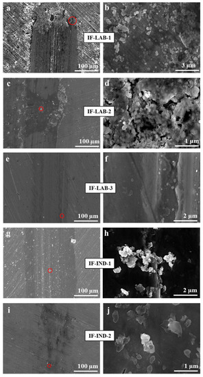 The images display an obvious difference in the nanoparticles’ distribution within the tracks. For sample IF-LAB-1, large clusters of the non-coated IFs are seen around the wear track and with only a few clusters within the track (a). A closer look (b) at the area circled in red reveals densely packed, micron-sized aggregates of nanoparticles. This means that a large portion of the aggregates cannot penetrate the interface. The NPs in the lubricant containing IF-LAB-2, with a thin coating, still form large clusters. The clusters are concentrated mostly in the track margins, a few are found within the track, and unlike the non-coated IFs, far fewer clusters are seen outside of the track area. The NPs in the lubricant containing IF-LAB-3, with a thicker coating, form tiny clusters (almost not visible under low magnification), allowing them to penetrate the grooves in the interface and successfully fill them.