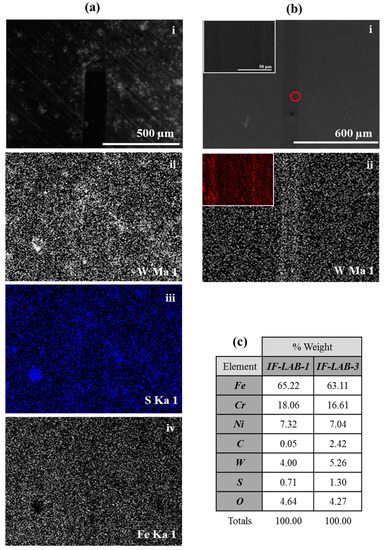 EDS elemental mappings for plates tested with (a) non-coated IF-LAB-1: mapped area (ai), tungsten (aii), sulfur (aiii) and iron (aiv); (b) coated IF-LAB-3: mapped area (bi), and tungsten (bii); (c) comparative chemical compositions.