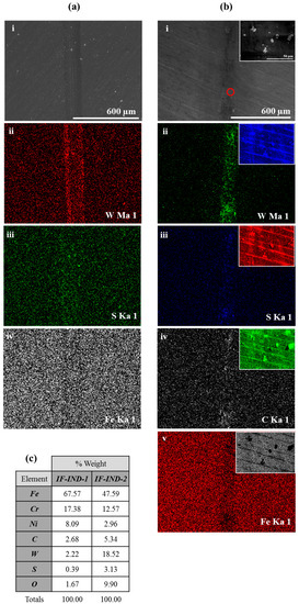 EDS elemental mappings for plates tested with (a) non-coated IF-IND-1: mapped area (ai), tungsten (aii), sulfur (aiii) and iron (aiv); (b) coated IF-IND-2: mapped area (bi), tungsten (bii), sulfur (biii), carbon (biv), and iron (bv); (c) comparative chemical compositions.