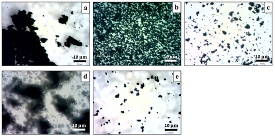 OM images of 1% dispersions of coated and non-coated WS2 IFs in paraffin oil: (a) IF-LAB-1; (b) IF-LAB-2; (c) IF-LAB-3; (d) IF-IND-1; (e) IF-IND-2.