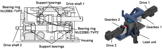 The rolling contact tests were performed on a self-developed two-disc test rig (Figure 1). Two inner rings from radial cylinder roller bearings of type NU208-TVP2 and NU2208-TVP2 are used as test specimens. The bearings rings are made from martensitic hardened 100Cr6 steel—conform to the DIN EN ISO 683-17 requirements—and are powered by independent servomotors. The freely adjustable SRRs are set by varying the speed ratio of the drive units. The variable static load is applied using a loading lever connected to the upper shaft and an electrical motor with integrated spindle. The lubrication of the test specimens and the support bearings is carried out by a circulating immersion lubrication system. The oil temperature can be adjusted using an electric heater. Testing is carried out until either a predefined number of contact load cycles is reached or a vibration level, normally caused by pitting or spalling, surpasses a set threshold.