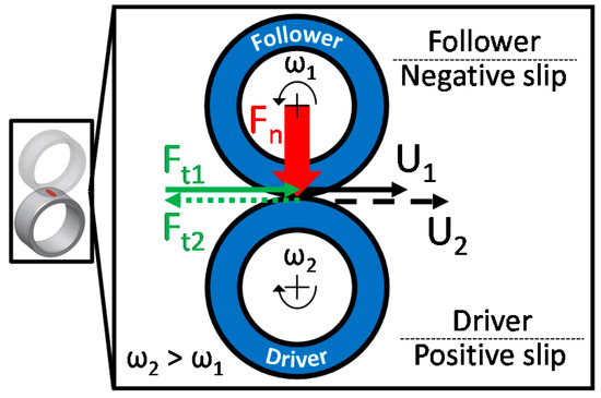 Aside from conditions under pure rolling (0% SRR) a tangential traction force, caused by the sliding friction, is transmitted between the contact surfaces. It has been proved that the RCF is influenced by both the magnitude and the direction of the tangential traction force [16]. While the contact surface, which is running with the lower surface velocity—i.e., “follower”—experiences a traction force vector in the direction of the surface motion vector, the contact body with the higher surface velocity—i.e., “driver”—experiences a traction force vector opposed to the direction of the surface motion vector. Previous literature [15,16,17] have used the terms negative slip (follower) and positive slip (driver) to describe these contact states (Figure 2).