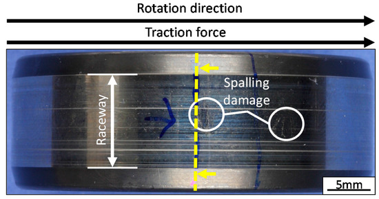 Within these tests, four followers (NU208) and one driver (NU2208) showed spalling. The development of surface spalling can be observed exemplary in (Figure 3). As RCF proceeds, a cluster of micro-cracks is formed, which ultimately leads to spalling of material. In contrast, the driver from test 6 showed axial cracks.