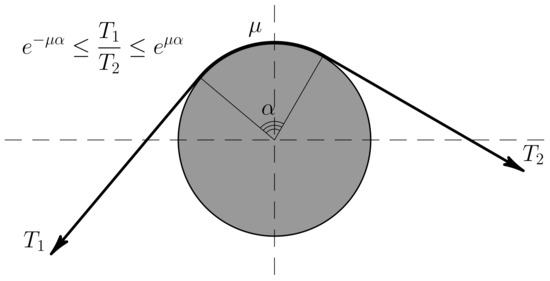 Since the 18th century, Coulomb’s friction law for ropes is known. It is called Euler-Eytelwein or Capstan equation and can be derived from simple geometric projections of the normal and tangential forces. It is widely used in the modeling of yarns, wires and ropes, e.g., [4,8,9]. In the two last references, the Euler-Eytelwein law was extended to a spiral rope on a cylinder via geometrically exact beam models.