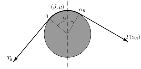 When the fiber is not straight, stick and slip conditions change their form. For the case of fiber in a contact with rigid cylindrical surface the friction stick or slip condition is given by the Euler-Eytelwein formula, also known as capstan equation or belt friction equation, see, e.g., [18]. It is illustrated in Figure 1. It has the following form: