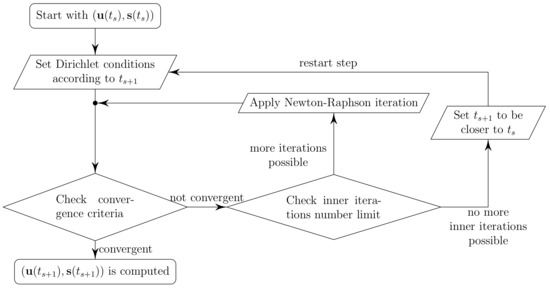 The problem corresponds to the structure without any outer forces, while is equivalent to (46)–(48), the equations with applied outer forces and boundary nodal displacements (Dirichlet values) that have to be solved. We assume that for some values and the solution to is known. Then we approach to the solution of , consequently solving for , where and points and are close in some sense (K is the number of necessary iterations). The benefit of such method is that to numerically solve problem one can use the solution of as the initial guess, thus ensuring the convergence of each single step and then the whole algorithm.
