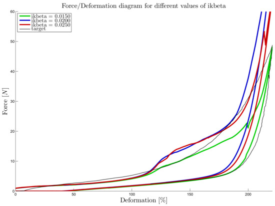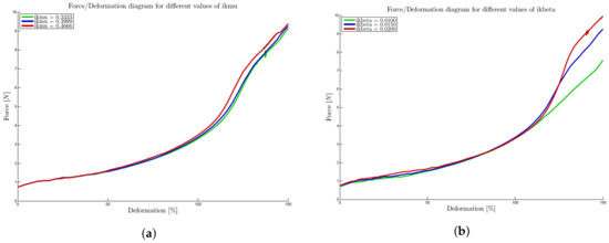 In Figure 6b, we varied the adhesion parameter between the inlay and knitting yarn in the measured range. The parameters , were taken as in the first example, . The knitting yarns were pre-stressed by in both experiments. This example demonstrates that the introduced adhesion makes a difference in the stretching material response after stretch by factor 2. The considered fabric can be applied in the range 50–150% of the stretch, therefore the adhesion force may be significant.