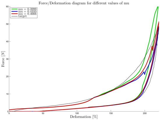 In Figure 6a, the friction coefficient between inlay and knit yarn, , was varied in the measured range, . Our computations show, that the error in measurements of the friction coefficient does not influence the macroscopic fabric behavior significantly. The experiments were performed under the adhesive force between the inlay and knit equal to the adhesive force between two knitting yarns in contact, N and the friction coefficient between two knitting yarns, .