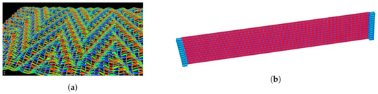 The force-strain curves of elongation and shutting yarns were provided by experiments in Figure 10a,b. The local simulation on the fiber structure shows some local fording pattern due to the weaving kind, providing some instability on shear loading in the structure, Figure 11a,b shows simulation of the belt stretching.