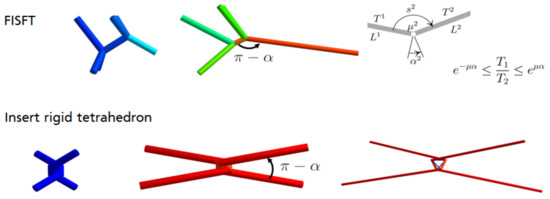 where is the friction coefficient between the fibers in contact and . Here, is the angle between the direction vectors of and , starting from the contact point (see Figure 12 for an illustration in an example).