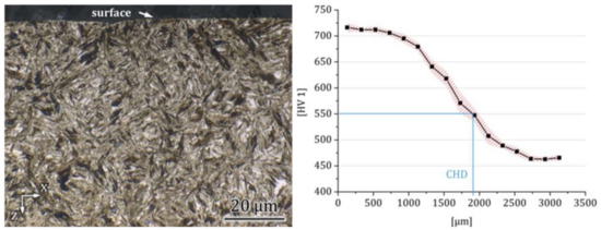 Microstructure and hardness profile of case hardened 18CrNiMo7-6 (Tribocouple CS/CS). The dashed area represents the scatter of the hardness profiles measured at different samples.