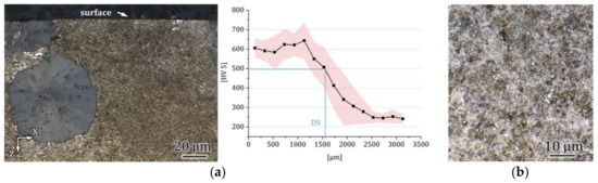 Spheroidal cast irons like EN GJS-HB265 (EN JS2070) are characterized by globular precipitation of graphite. This leads to higher ductility compared to cast iron with vermicular or lamellar graphite precipitates. Hence, they are also referred to as ductile cast iron. Due to their good mechanical properties and castability, they are used in complex and highly loaded parts, like engine components such as crankshafts or pistons. The cast iron samples were flame hardened to about 700 HV10 and a conventional hardening depth (DS) of about 1.7 mm (Figure 2a). According to typical applications, the flame hardened cast iron was used to run in a non-self-mating tribocouple designated as CI/BS against the standard ball bearing steel 100Cr6 (1.3505, AISI 52100) with a hardness of 61 HRC (Figure 2b).