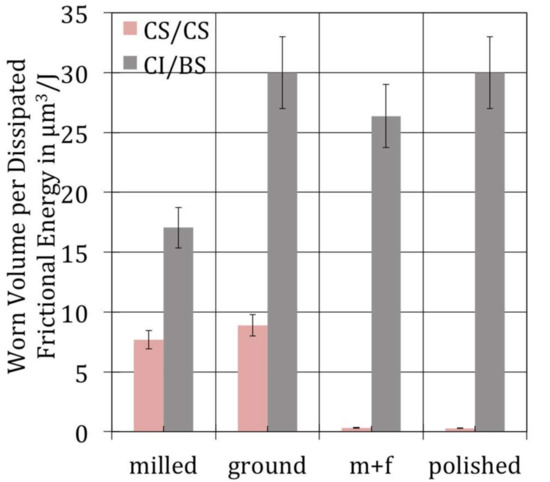 If one relates the worn volume WV to the dissipated frictional energy Ed accumulated over 2 × 106 sliding cycles, it also becomes clear that there is no clear tendency as to the topographies for tribocouples (Figure 3). In order to wear away a certain volume from the surfaces in contact the CS/CS tribocouples would need to dissipate distinctly more frictional energy compared to CI/BS. In a first approach, this can be seen as a much smaller capability of the latter to transform the introduced frictional energy into something that does not result in material loss.
