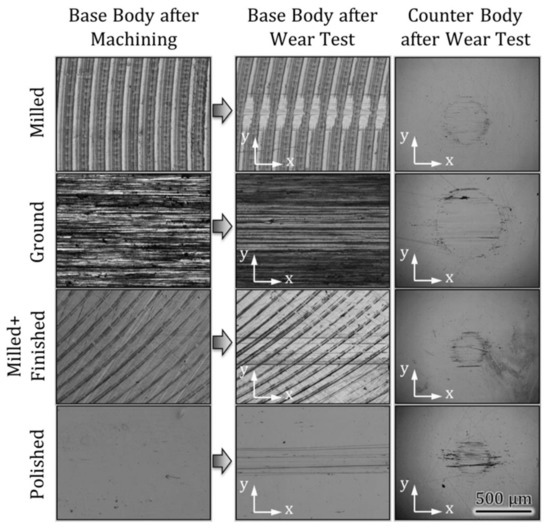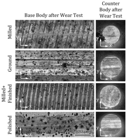 The opposite behavior of the ground and the milled tribocouples with regard to the wear of the counter and the base bodies, respectively, could be influenced by the orientation of the machining marks of the base bodies. The grinding marks of the ground base body run parallel to the sliding direction, probably allowing the summits to plough into the counter body, therefore, facilitating microploughing as well [31]. In the milled case, the machining marks are oriented perpendicular to the sliding direction. The stresses during sliding give rise to plastic deformation at the summits of the milled topography, consequently causing material to be pushed off the plateau (Figure 5).