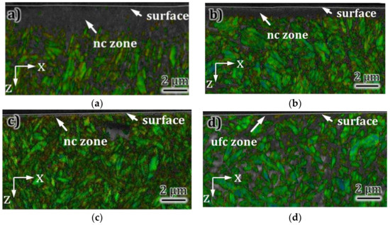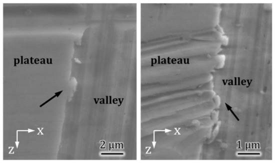 In order to properly analyze such near- or sub-surface structures one has to distinguish between either amorphous, nanocrystalline and/or chaotic surface layers and the underlying strain gradient, which is generated by the accumulation of cyclic plastic strains [17,18]. In contrast to this, the tribomaterial appears like a shear band [19], which is caused by monotonic stresses and strains similar, but not equal, to what is known from severe plastic deformation [45] (Figure 12). However, despite the intensive research of the last 70 years any direct or even quantitative relation to the so-called elementary processes like, e.g., the generation of lattice defects is still missing.