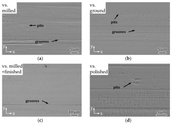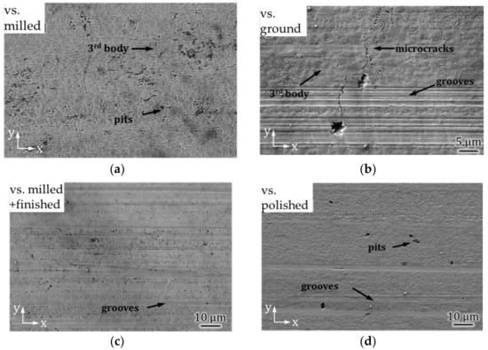 Surface appearances of the base bodies after CI/BS wear tests. (a) tested against the milled base body; (b) tested against the ground base body; (c) tested against the milled + finished base body; (d) tested against the polished base body. Direction x is parallel to the relative velocity.