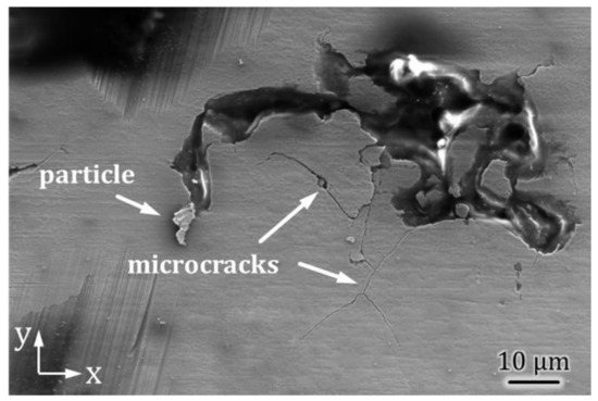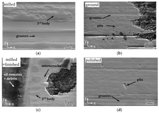 Thus, at a higher magnification the ground (Figure 8b) and polished (Figure 8d) surfaces appear only slightly plastically deformed with some pits, while the milled (Figure 8a) and the milled + finished (Figure 8c) samples show patches of former debris sticking rigidly to the surfaces. These patches consist mainly of P, Ca, S, and Zn and are known to be usual constituent of such cast irons. They are also found on the ground and polished surfaces, even though to a smaller extent [31]. The formation of such patchy third bodies could already originate from machining debris. For the milled and milled + finished samples microcracks were observed in the vicinity of graphite nodules (Figure 9). Such appearances also called metal sheaths around graphite nodules are known to be generated by machining [32]. Under tribological stresses such sheaths would be torn off and can result in the formation of larger and shallow particles that form those patches (Figure 8).