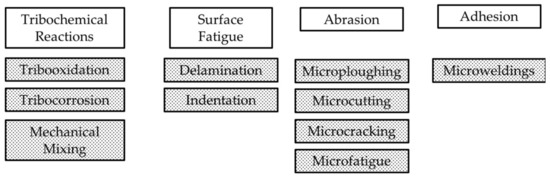 We distinguish between four main wear mechanisms: “Abrasion”, “Adhesion”, “Surface Fatigue” and “Tribochemical Reactions”, which are related to and can be defined by certain wear appearances. The alterations of the surfaces as to topography, chemistry, and microstructure as well as changes of the interfacial and surrounding media led to the further definition of so-called sub-mechanisms. This somewhat rough scheme (and even though not all sub-mechanisms are known or have yet been sufficiently investigated) has been proven to allow for targeted countermeasures [36]. Table 3 sums about up the current state of sub-mechanisms known to the authors.