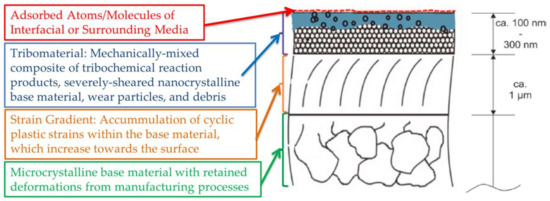 Scheme of surface and subsurface structures generated under tribological stresses based on [30,34,46].