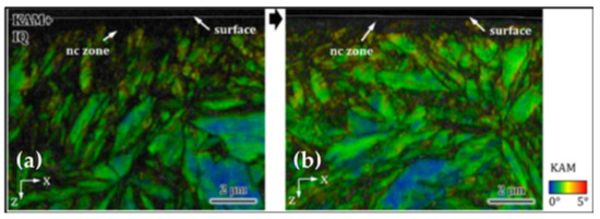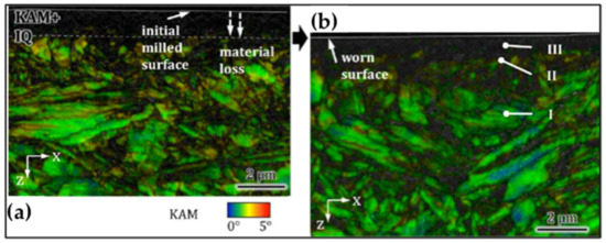 The KAM images (Figure 14) of the unworn (Figure 14a) and worn (Figure 14b) state appear similar with a highly deformed layer at the surface, which by EBSD appears just black and shows so called “no-counts”. This method cannot resolve severely deformed microstructures. Nonetheless, inside the highly deformed surface layer some small and less deformed areas can be seen. These are fragments of the former microcrystalline martensite plates.