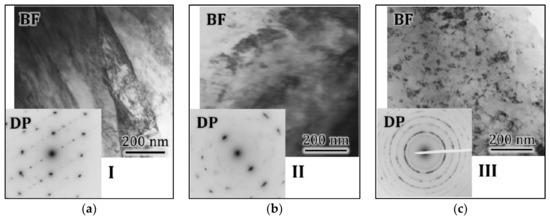 Position I (Figure 15a) displays the bulk microstructure structure with the typical microcrystalline martensitic appearance. At position II (Figure 15b) the diffraction pattern slightly appears as rings pointing towards an increasing defect density as well as grain refinement. Towards the surface the microcrystalline structure vanishes completely by further grain refinement down to sizes below 100 nm at position III (Figure 15c).