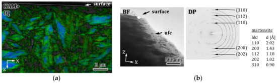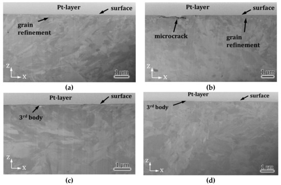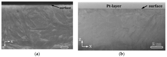 The polished counter body depicts a microcrystalline martensite up to the surface (Figure 16a) before wear testing while the FIB cross-section after being tested against the milled sample a marginal lattice distortion of the near-surface zone is hardly observable (Figure 16b).