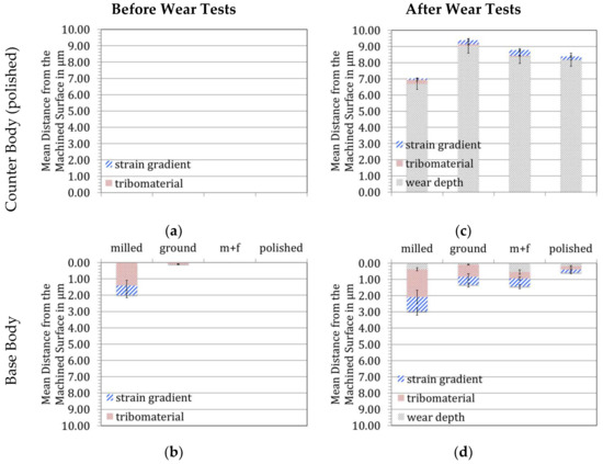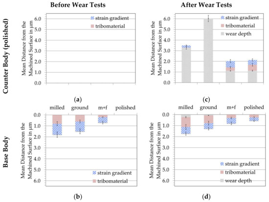 By comparing the near- and subsurface zones of the base bodies after the wear tests as to possible strain gradients or tribomaterials, not even a qualitative ranking related to the surface topographies is possible (Figure 20).