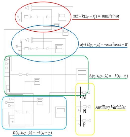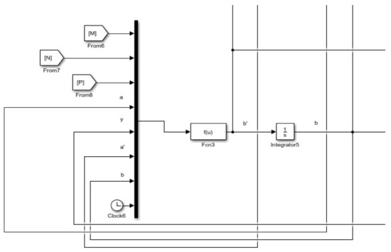 Simulink algorithm scheme—detail of Equation (13). The variables (a,b) represent the coordinates of the centre of the journal (xj,yj).