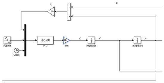 With the aim of obtaining a numerical solution for the dynamic system of Equations (10)–(13), in this study an original algorithm was developed in the Matlab®-Simulink environment. Figure 3 shows as example the global Simulink scheme in the case of an uncavitated bearing.