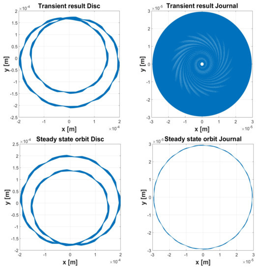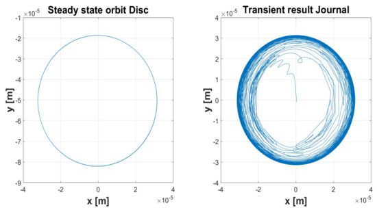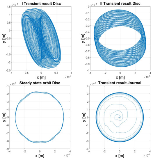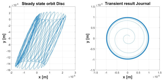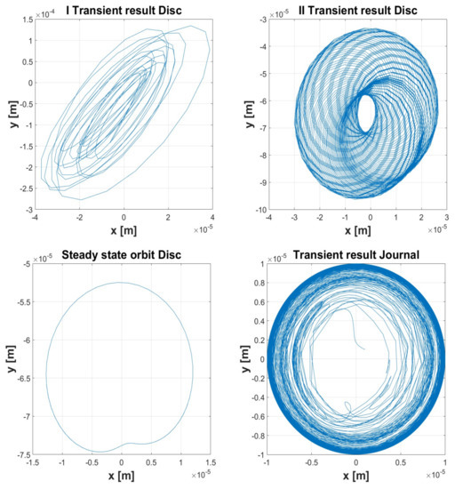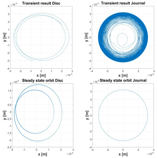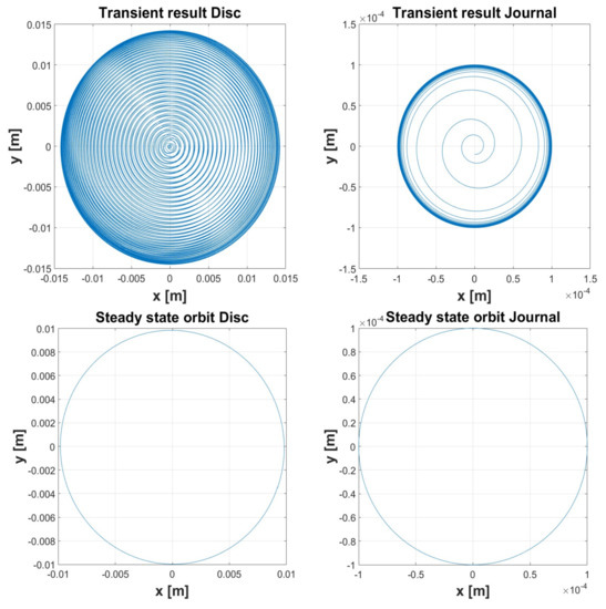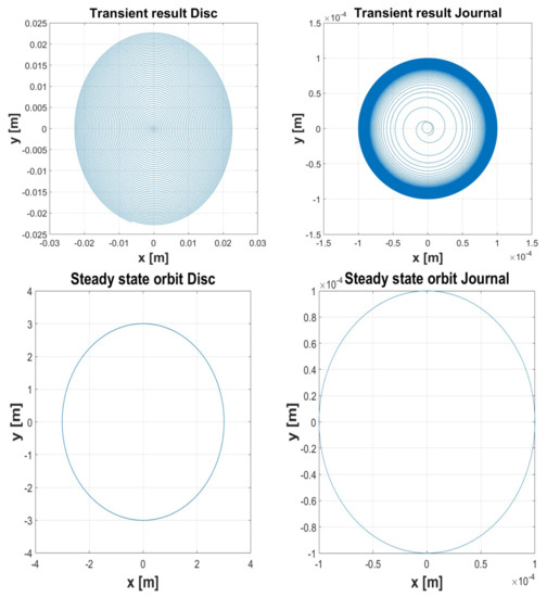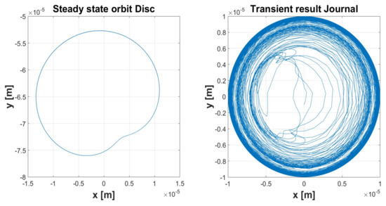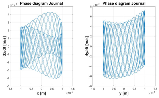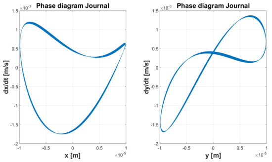 In this section are presented the results for the simulation 2 (Table 1) for the uncavitated short bearing (Figure 10, Figure 11 and Figure 12) and cavitated short bearing (Figure 13, Figure 14 and Figure 15). In this simulation the orbit assumes a particular shape during both the transition phase and during the steady phase reaching a stable operating condition. This can be observed in the phase diagrams, which show well-defined limit cycles (Figure 11 and Figure 14).