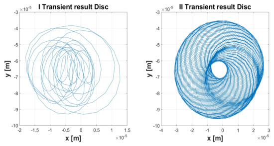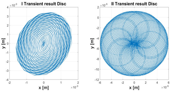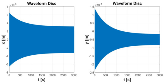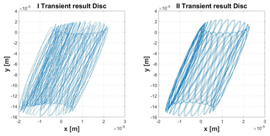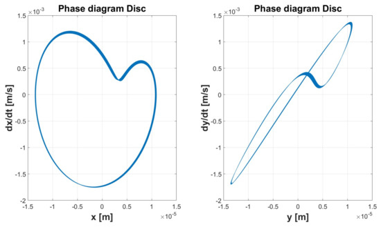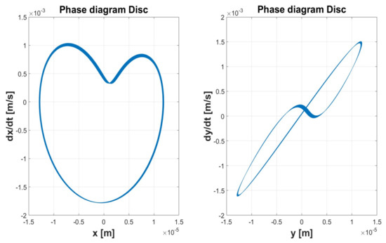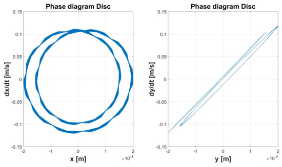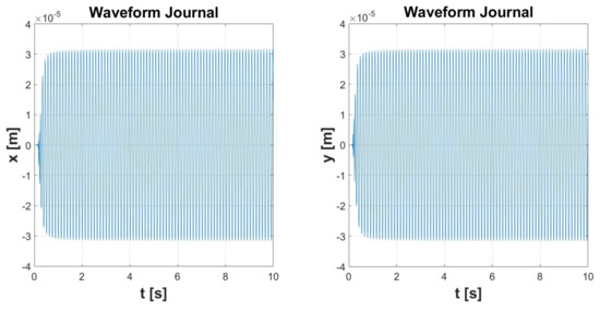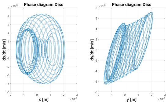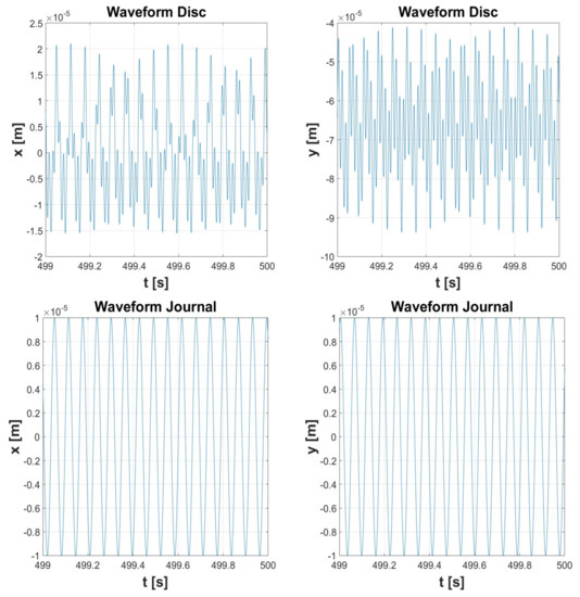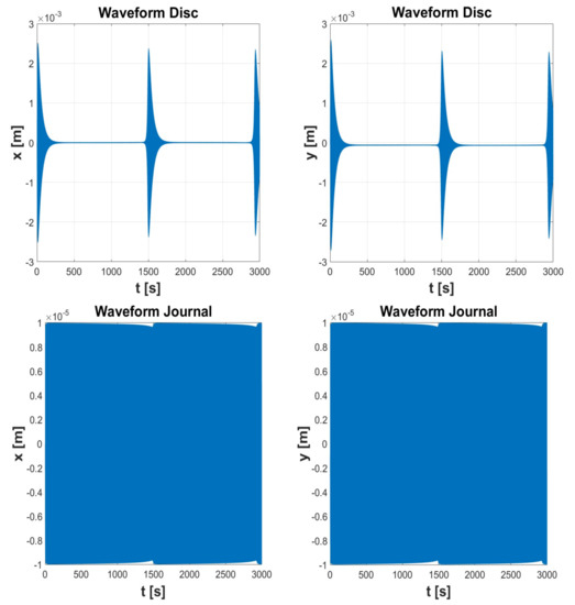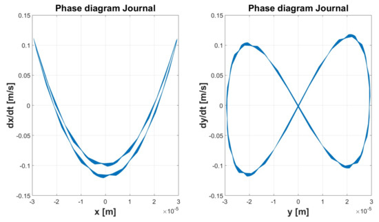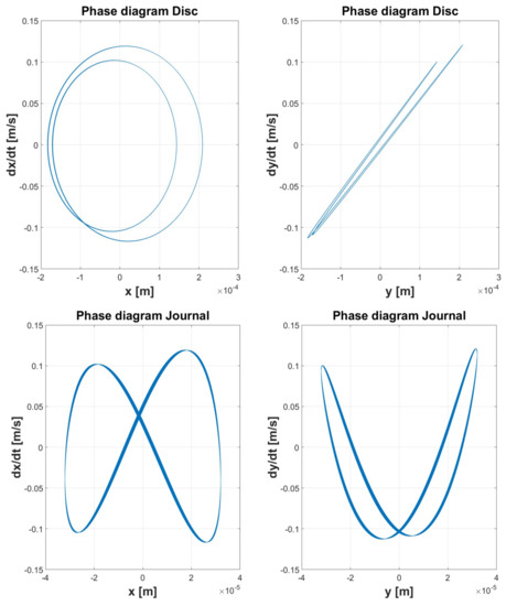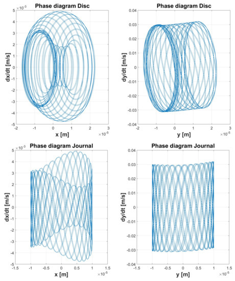 In the case of the uncavitated short bearing, it was possible to extend the simulation time. This allowed observation of a certain periodicity in the displacement diagrams (Figure 20). The Figure 22 shows the waveform of the journal. The oscillation of the centre of the disc increased every 1500 s. It reached a maximum amplitude that decreased over time, so it is possible to predict that this phenomenon is extinguished in time. Regarding the motion of the journal centre, the oscillation undergoes changes at instances in time in which there are variations of oscillation of the disc centre. This indicates that the perturbation involves the whole system. The orbit of the centre of the disc (Figure 23) is not circular. This phenomenon can be explained by analysing the power spectrum (Figure 24). The power spectrum reveals significant vibrations at frequencies near 15, 30 and 60 Hz, i.e., corresponding to ω/2, ω and 2ω. This means that the system is affected by the sub-synchronous vibrations and vibrations two per revolution. From these observations, it seems that the orbit of the disc centre has a particular form. The phase diagrams denote stability since they show well-defined closed curves (Figure 25).