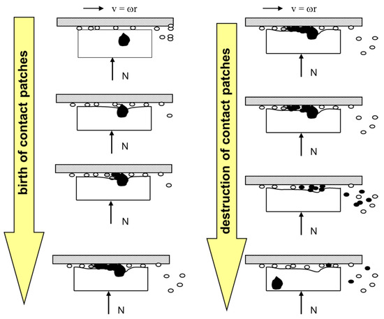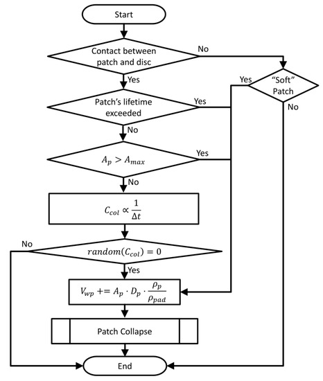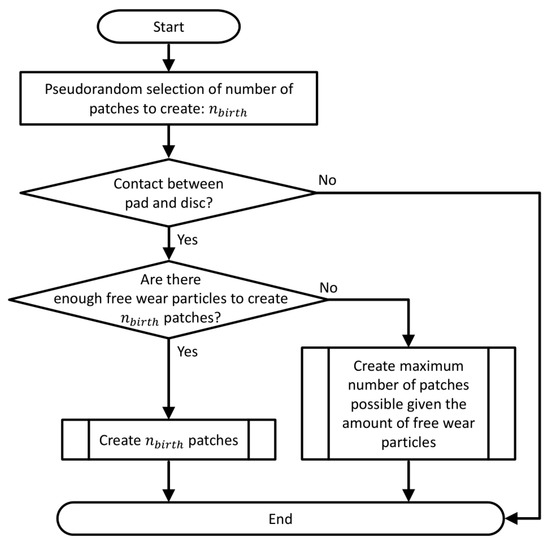 As shown in Figure 6, the only conditions required for patch birth to take place are that the disc and pad need to be in contact, and that a sufficient volume of wear particles is present in the tribological interface to create the respective patches. For simplicity, a single representative patch volume is considered toward determining if the latter condition is satisfied. It is taken into account that the patch density is greater than that of the pad material density (and likewise that of the wear particles). The parameter is comprised of a pseudorandom component with a uniform distribution and deterministic components based on the brake pad material (NAO, low-met) and the simulation time step. For , it can range between 0 and 84. The symbol represents the function floor (x), which returns the greatest integer less than or equal to .