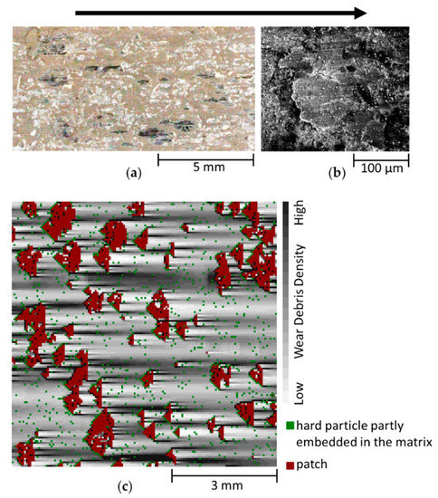 Magnified brake pad boundary layer with patches: (a) brake pad sample with visible patches (dark spots). Brightness and contrast are adjusted to make the patches more clearly visible; (b) reflection electron microscope (REM) image of a brake pad showing a patch, adapted from Ref. [6]; (c) screenshot from a classic grid-based cellular, adapted from Ref. [7]. The arrow points in the direction of motion of the brake disc for all images.