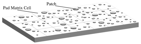In early versions of the classical grid-based cellular automata, broad approximations were used to calculate the normal force on the patches and pad matrix cells focused on developing models based on the local discretization of a continuous half-space [7]. This resulted in rather precise results for the normal force and deformations of all cells in the cellular automata, but was associated with significant computational costs. Therefore, instead of a half-space, a Winkler dynamic bedding modulus is assumed, which is achieved without unacceptable accuracy losses. This model is illustrated in Figure 9. For the computation of the normal force distribution, the materials of the patches and pad matrix are considered separately. Here, each matrix cell is represented by an individual spring, and each patch cell is modeled as a second spring, serially connected to the corresponding matrix cell. Known material parameters are implemented for modeling the spring stiffnesses of the pad matrix. The patches are generally considered to be significantly denser and harder than the pad matrix, and are therefore modeled with comparably high spring stiffnesses. Such a model allows for the simple implementation of patches of varying height.