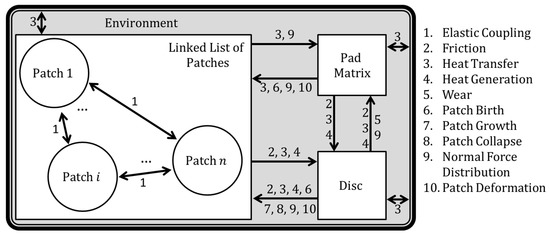 As the tribological interface between the pad and the disc has the most substantial influence on the friction behavior of the system, the computational effort is focused on this layer, which is modeled through an analysis of the contact patches in the interface. These computations are carried out using an approach similar to that of N-body simulations. A linked list containing pointers to all of the patches is implemented. At each time step, a series of functions are carried out at each individual patch. Here, the physics within the individual patches are computed, along with the following interactions: patch-pad (interaction between patches and the bulk matrix material of the brake pad; for example, thermal conduction), patch-disc (for example, friction), and patch-patch (interactions between neighboring patches). An example of a patch-patch interaction is the tangential elastic coupling between patches, which will be discussed below.