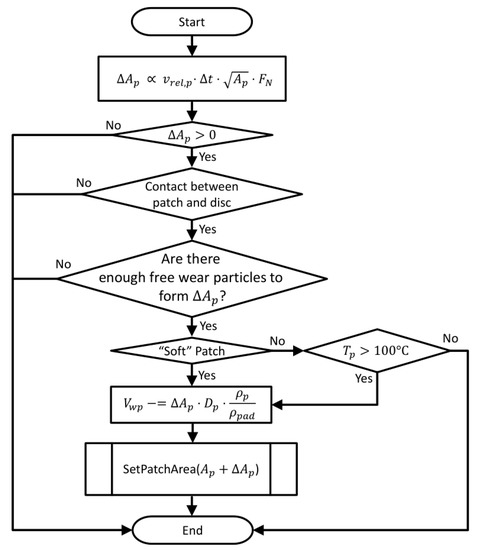 Once a patch already exists in the Abstract Cellular Automaton, it has the potential to increase in surface (and thereby contact) area. The algorithm employed is made explicit in Figure 7. First, the magnitude of the increase in patch area is determined. The square root of the current patch area is used as a factor in this step because new wear particles collect along the perimeter of the patch. The magnitude of patch growth is therefore directly proportional to the size of this perimeter. This value is then scaled according to reference values for the normal force and pad area. If the resulting value is nonzero, the patch is in contact with the disc, and sufficient wear particles are present to form the extra patch mass, growth can theoretically occur. If the patch is a “soft” or “white” patch, meaning that it consists of self-locked wear particles that have undergone no chemical change [15], the conditions for patch growth are already fulfilled and growth occurs. If it is a “hard” or “black” patch, meaning it is coated with an oxide layer, an additional minimum temperature condition must also be fulfilled for growth to occur. When a patch grows, the amount of wear particles needed to create the additional patch mass are removed from the tribological boundary layer.
