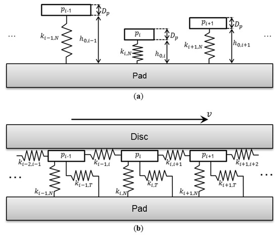 On a real brake pad, the tangential motion of one patch (along the direction of the disc’s motion) is related to the deformation of the pad material near that patch. The motion of a neighboring patch is coupled to the motion of through this deformation. In the Abstract Cellular Automaton, this coupling is accounted for using a lumped element model based on Ref. [12], as shown in Figure 10b. Here, the coupled vibrations of patches in the friction boundary layer are simulated under the assumption that the patches act as coupled stick–slip oscillators. The tangential coupling of an individual patch to the matrix of the brake pad is simplified through a single, linear spring.