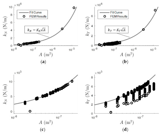 Figure 11 shows that the stiffnesses of the patches in both the normal and tangential directions can be closely approximated as proportional to the square root of the patch’s area. The resulting functions used are given in Equations (4) and (5):