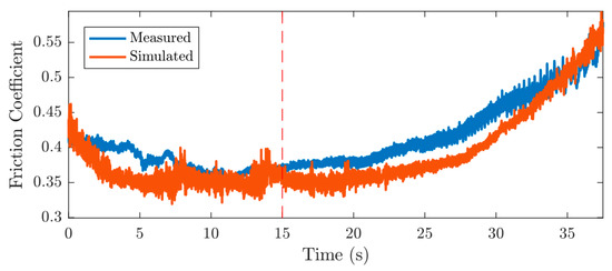 In Figure 12, a measurement application is compared with simulation results from the Abstract Cellular Automaton. In the first 15 seconds of both the measured and simulated brake applications, a constant sliding speed of is imposed. Starting at , a linear velocity ramp is imposed until a sliding speed of is reached. It can be observed that the overall dynamics of the coefficient of friction during a stop braking application are well represented by the Abstract Cellular Automaton.