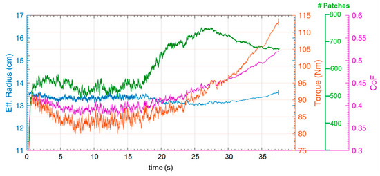 Although some new techniques have been developed towards directly measuring the local behavior at the friction interface [18,19], it has been shown that the Abstract Cellular Automaton allows researchers to perform more generalized analyses, considering the unique dynamics of the coefficient of friction and the effective friction radius [16]. Thus, one has the opportunity to gain more nuanced insights into the interactions between these phenomena, and it is possible to interpret the total braking torque as an emergent combination of these dynamics (Figure 14). Furthermore, Figure 14 exemplifies the potential for observing the complex interactions between the aforementioned phenomena and the total number of patches in the interface.