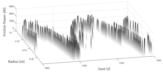 The total sum of the friction power at all patches and all pad matrix cells within each radial section was computed. As seen in Figure 15, the location of maximum friction power oscillates radially along the interface. These studies were carried out using constant normal loading conditions on the brake pad. Realistic, variable normal load development on the pad are also simple to implement.