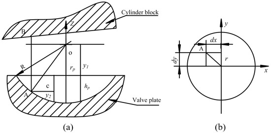 Figure 1 shows the geometry of a micro-hemispherical texture element relative to the surface of the valve plate. The cylinder block is located in the upper part of the graph, while the micro-hemispherical texture is located in the lower part of the graph. Figure 1a is the front view of the mathematical model for the micro-hemispherical texture’s depth, while Figure 1b is the top view of the mathematical model. We defined hp as a distance from the bottom center of micro-hemispherical to the surface of valve plate, rp is the radius of the micro-hemispherical texture, while r is the distance from point A on the micro-hemispherical to its center.