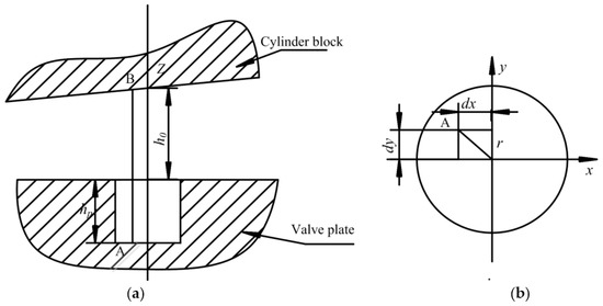 Figure 2 shows the geometry of a micro-cylindrical texture element relative to the surface of valve plate. We defined hp as a distance from the bottom center of micro-cylinder to the surface of valve plate, h0 is the initial oil film thickness, while r is the distance from point A on the micro-cylindrical texture to its center. This can be calculated as follows: